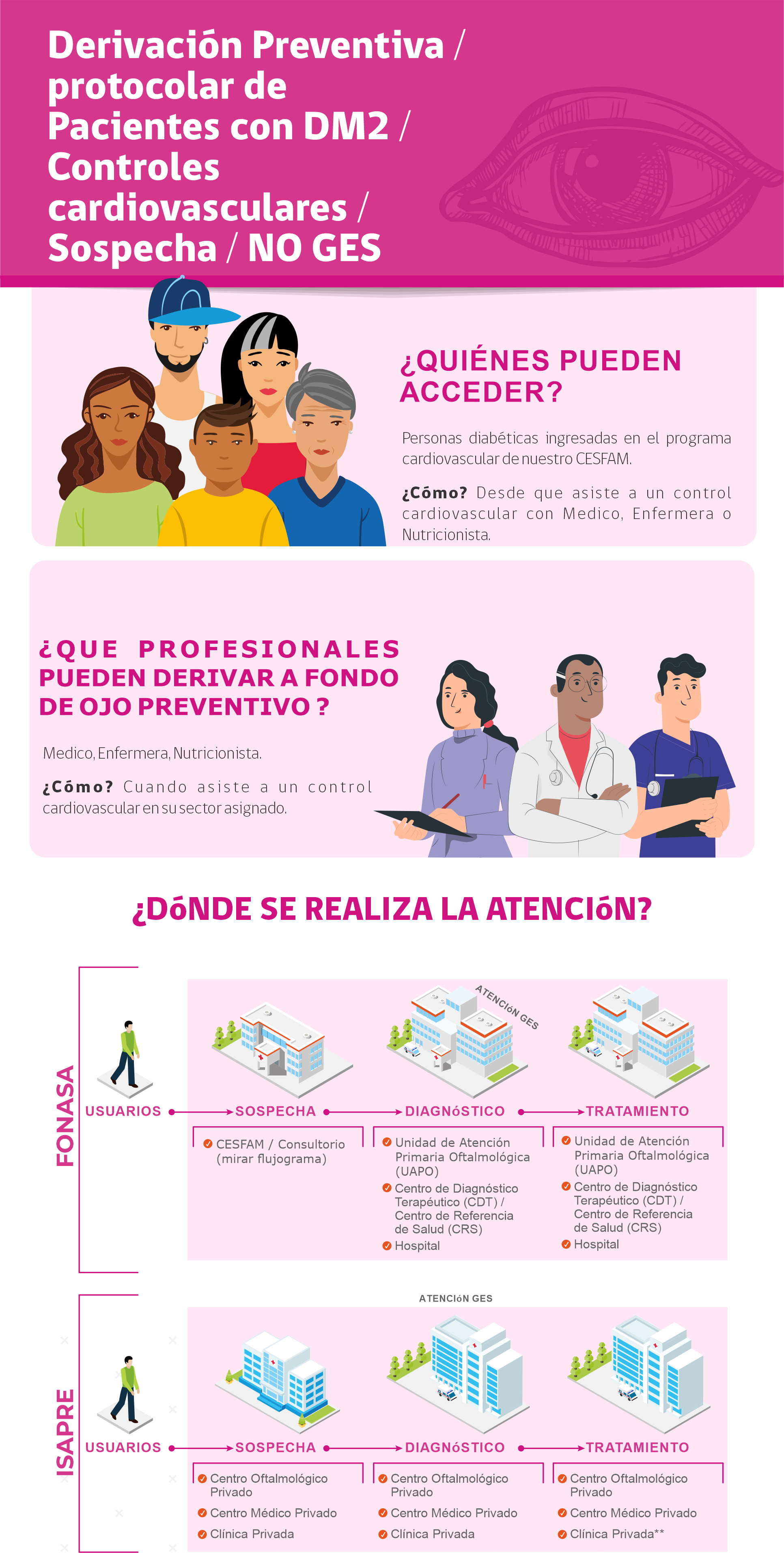El propósito de esta guía es orientar la toma de decisiones del equipo de salud para la elaboración de la solicitud de interconsulta (SIC) preventiva anual de fondo de ojo en los usuarios diagnosticados con diabetes confirmada por medico en la ficha electrónica y que se encuentran ingresados al programa cardiovascular. Con el fin de reducir la devolución de interconsultas por error en su derivación a la unidad de atención primaria oftalmológica (UAPO) correspondiente.